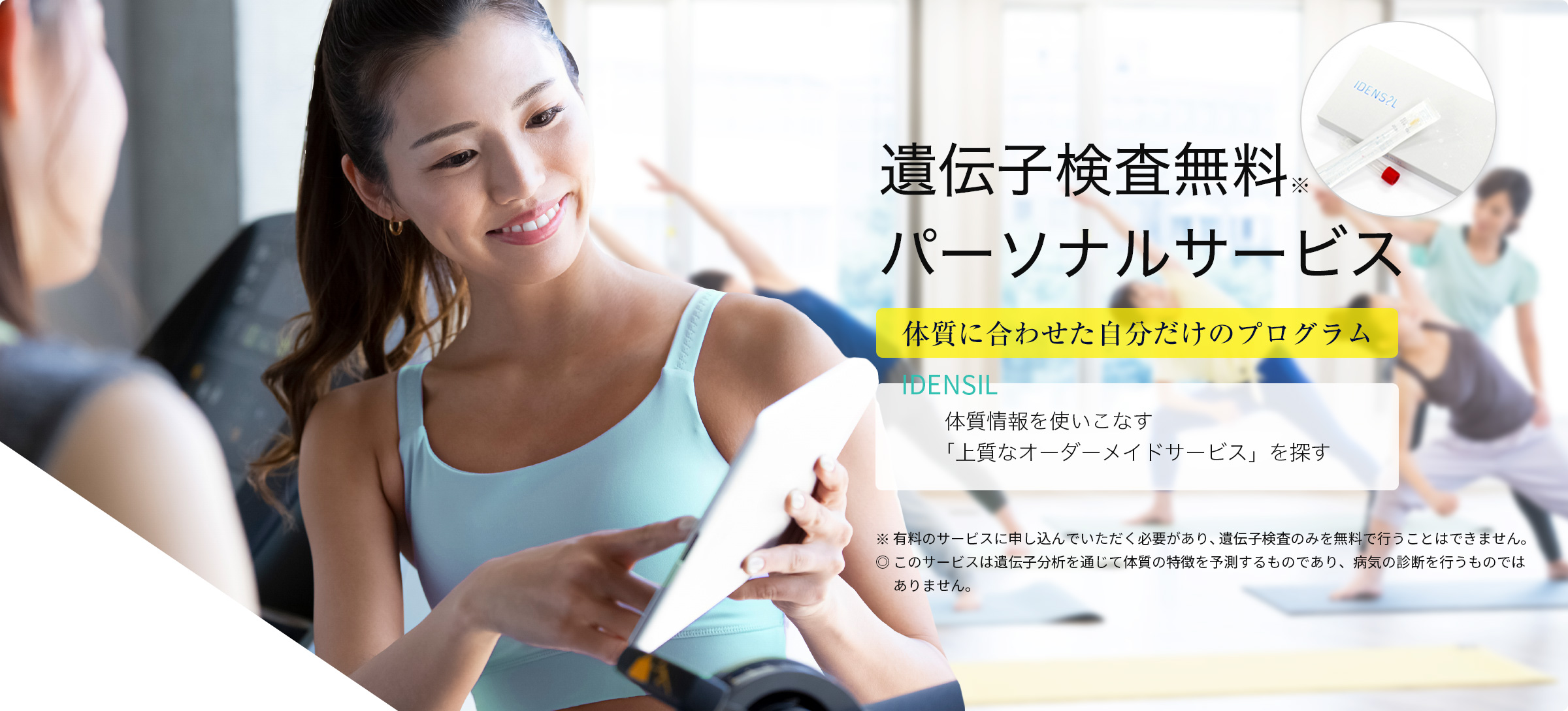 そんなIDENSILを無料で※受けられて、体質情報に基づいた、あなただけのサービスを探して受けられるサイトです。一度の遺伝子分析で、掲載されているすべてのサービスを、何回でもお申込みいただけます。