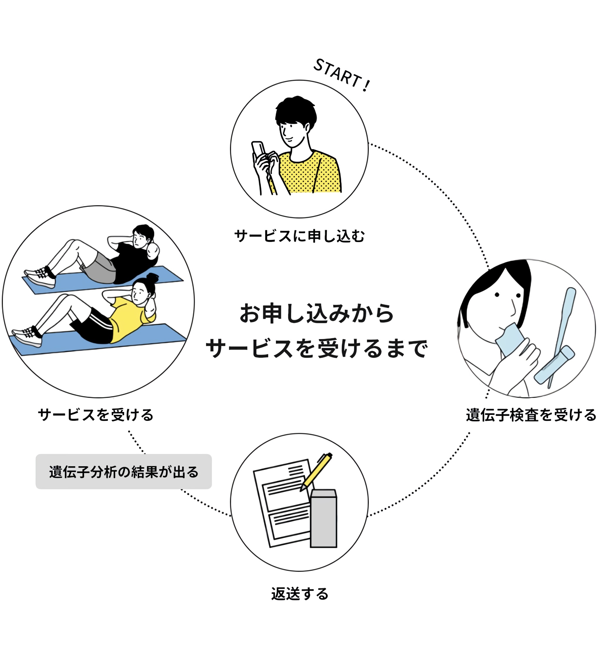 受けたいサービスに申し込みをすると、遺伝子検査キットが送られます。その結果をもとにプロがあなた専用のメニューを組むことで、ご自身のさらなる体調管理やステップアップに活かしていただくことができます。